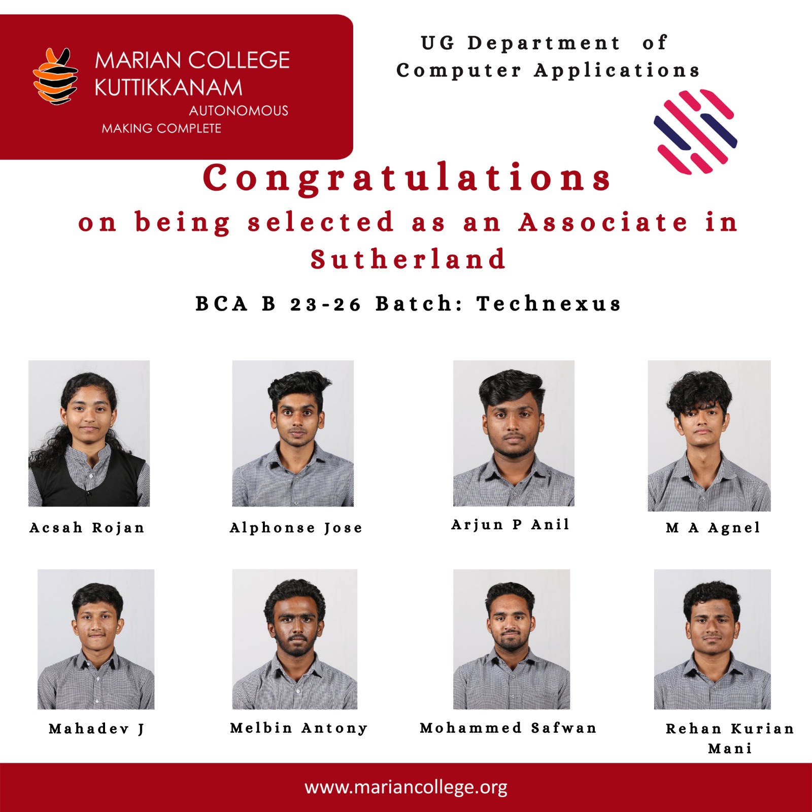 I can say with pride that I have completed my post-graduation at Marian College. The institute is technologically advanced and offers an ideal study environment. Here I found people who were supportive and guided me on the path to my degree. The faculty members are helpful and informative. I want to thank the Department of Computer Applications for providing the best curriculum with highly-qualified professors and the placement team for conducting various technical and soft skills sessions.