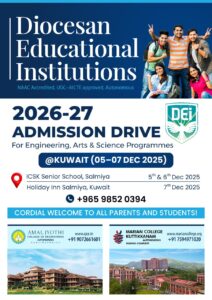 The Educational Institutions of the Diocese of Kanjirapally Amal Jyothi Engineering College and Marian College Kuttikanam (NAAC accredited, UGC–AICTE approved, Autonomous) will be conducting the 2026–27 Admission Drive in Kuwait from 5–7 December 2025 for Engineering, Arts, and Science programmes. The admission interaction will be held at ICSK Senior School, Salmiya on December 5 & 6, and at Holiday Inn, Salmiya on December 7. Parents and students in Kuwait are warmly invited to meet representatives from Amal Jyothi College of Engineering, Kanjirappally and Marian College Kuttikkanam (Autonomous) to explore academic opportunities for the upcoming year.