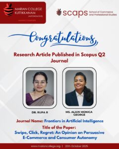 The School of Commerce and Professional Studies (SCAPS) at Marian College Kuttikkanam (Autonomous) proudly congratulates Dr. Rupa R and Ms. Alain Monica George for their publication in the Scopus Q2 indexed journal, Frontiers in Artificial Intelligence.