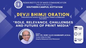 The Indian Institute of Mass Communication (Southern Campus, Kottayam) hosted the prestigious Devji Bhimji Oration, dedicated to the memory of Devji Bhimji, a pioneer of Malayalam journalism. Rev. Fr. Boby Alex Mannamplackal, Former Editor-in-Chief of Deepika Malayalam Daily, delivered an insightful oration on “Role, Relevance, Challenges and Future of Print Media”. The session, held on 18 November 2025 at the Seminar Hall, explored the evolving media landscape and the enduring value of print journalism.