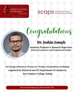 Dr. Joshin Joseph, Assistant Professor and Research Supervisor at the School of Commerce and Professional Studies, served as the Resource Person for the Project Orientation Workshop organized by the Research and PG Department of Commerce, Sree Sankara College, Kalady.