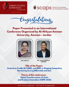 Dr. Rupa R and Ms. Alain Monica George from the School of Commerce and Professional Studies (SCAPS), Marian College Kuttikkanam (Autonomous), presented a research paper at the International Conference on Digital Transformation, FinTech, and Business Innovation (ICDFB 2025), organised by Al-Ahliyya Amman University, Amman, Jordan, on 26th and 27th October 2025.