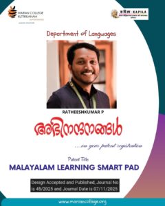 The Department of Languages celebrates the achievement of Ratheeshkumar P for successfully registering the design patent titled “Malayalam Learning Smart Pad.” The design has been officially accepted and published with Journal No. 45/2025, dated 07/11/2025, under the KAPILA initiative.