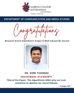 Fr. Sobi Thomas, faculty member of the Department of Communication and Media Studies, has published a research article titled “The Algorithmic Alibi: Why We Trust Machines to Absolve Our Moral Failures” in the Scopus and WoS indexed Q1 journal AI & Society.