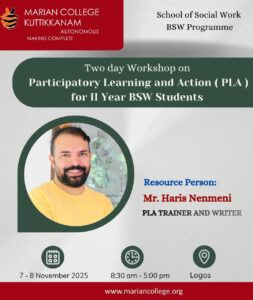 The School of Social Work, Marian College Kuttikkanam (Autonomous), is organizing a two-day workshop on Participatory Learning and Action (PLA) for second-year BSW students.