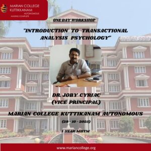 A focused workshop on Transactional Analysis (TA) Psychology was conducted for I-Year MHTM students on 29 October 2025 at Marian College Kuttikkanam (Autonomous). The session was led by Dr. Joby Cyriac (Vice Principal) and helped participants apply TA concepts (Parent–Adult–Child, ego states, life positions) to personal growth, teamwork, and hospitality service interactions.