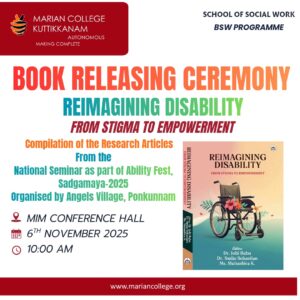 The School of Social Work (BSW Programme) will host the book releasing ceremony of Reimagining Disability: From Stigma to Empowerment, a compilation of research papers presented at the National Seminar during Ability Fest, Sadgamaya-2025. The event will be held on 6th November 2025 at 10:00 AM in the MIM Conference Hall.