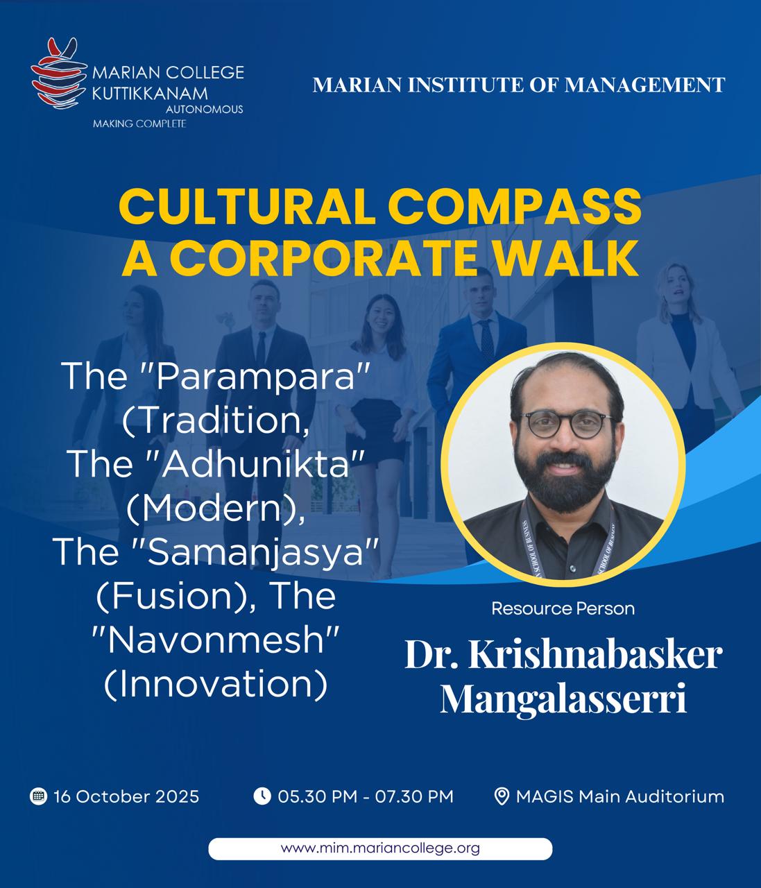 The Marian Institute of Management (MIM) organized a captivating session titled “Cultural Compass: A Corporate Walk” on 16th October 2025 at the MAGIS Main Auditorium. The session was led by Dr. Krishnabasker Mangalasserri, who explored the intersections of Tradition (Parampara), Modernity (Adhunikta), Fusion (Samanjasya), and Innovation (Navonmesh) within corporate culture.