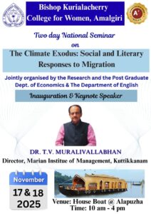 Dr. T. V. Muralivallabhan, Director of Marian Institute of Management, Kuttikkanam, will inaugurate and deliver the keynote address at the two-day National Seminar on “The Climate Exodus: Social and Literary Responses to Migration,” organised by Bishop Kurialacherry College for Women, Amalagiri. The event, jointly hosted by the Research and Post Graduate Departments of Economics and English, will be held on November 17–18, 2025, aboard a houseboat in Alappuzha, providing a unique platform for scholars and researchers to explore the intersections of climate change, migration, and literature.<br>