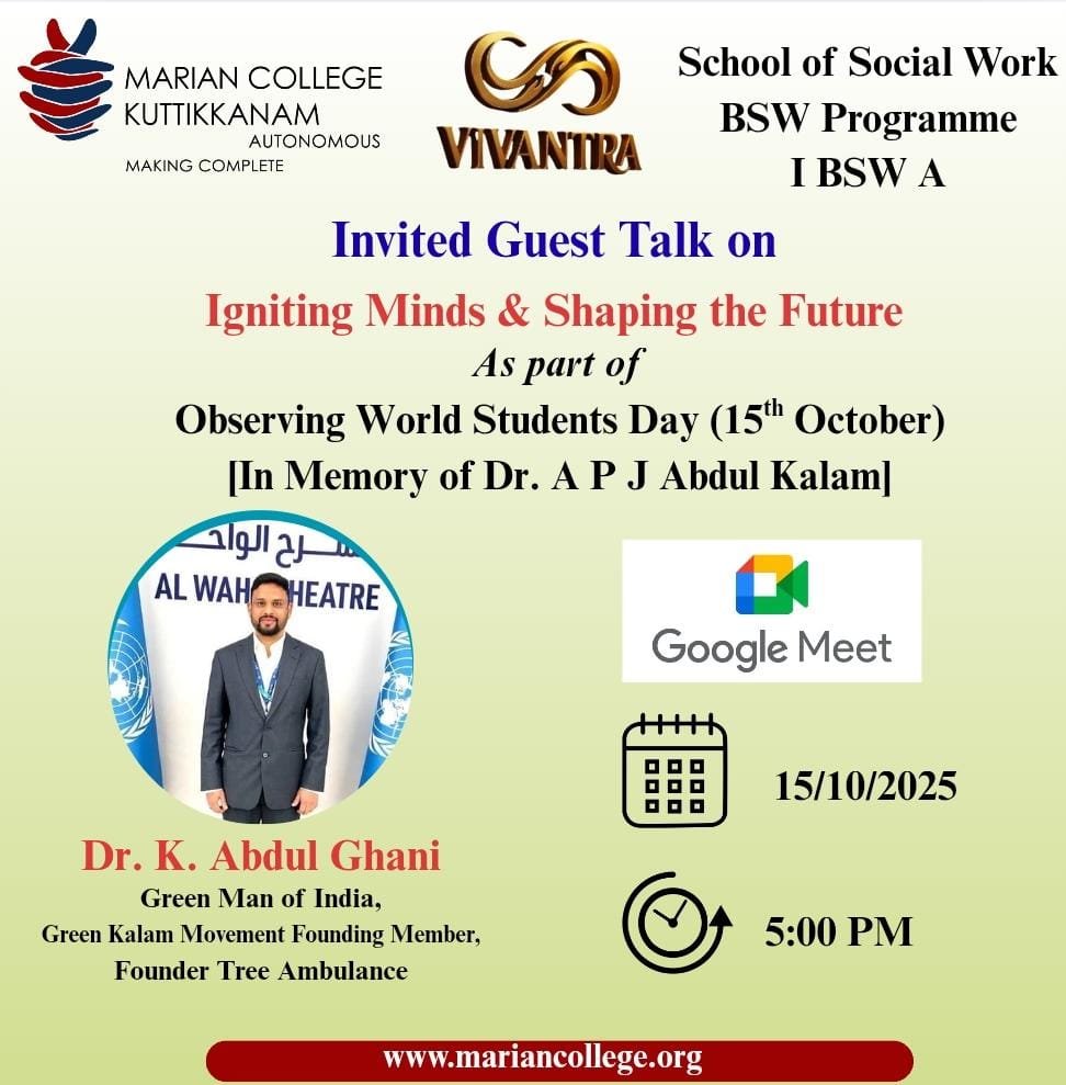 The School of Social Work at Marian College Kuttikkanam (Autonomous), under the BSW Programme, organized an Invited Guest Talk on “Igniting Minds & Shaping the Future” on 15th October 2025, in observance of World Students’ Day, commemorating the birth anniversary of Dr. A. P. J. Abdul Kalam.