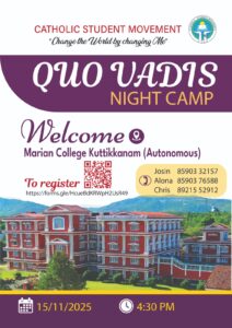 A spiritually enriching inter-eparchial night camp themed “Change the World by Changing Me”, will be hosted at Marian College Kuttikkanam (Autonomous). Open to CSM members and students seeking reflection, renewal, and fellowship from the dioceses of Kanjirapally, Changanachery and Pala.