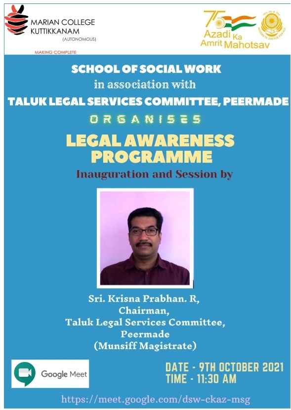 Description: As part of the Legal Information Course of BSW and Azadi Ka Amrith Mahotsav initiative of Central Government the SSW has organised the webinar in association with the TLSC, Peermade. Sri Krishna Prabhan R, Chairman TLSC Peermade and Munsiff Magistrate was the resource person. The program covered the rights of citizen constitutional provisions, functioning of judicial system provisions for free legal aid etc.